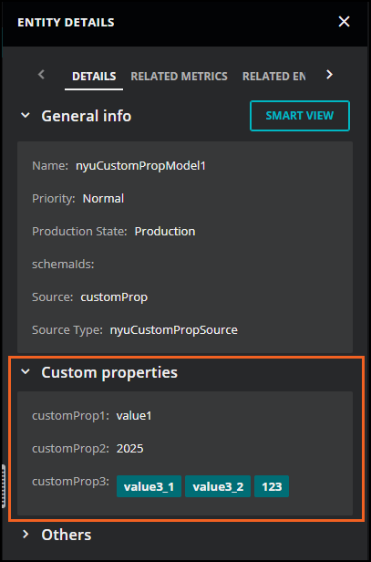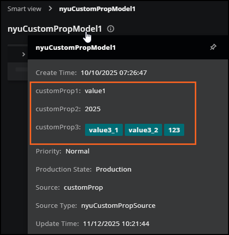 In Smart View, hover your mouse over the entity to open the entity details panel. If custom properties are associated with the entity, they are listed here.