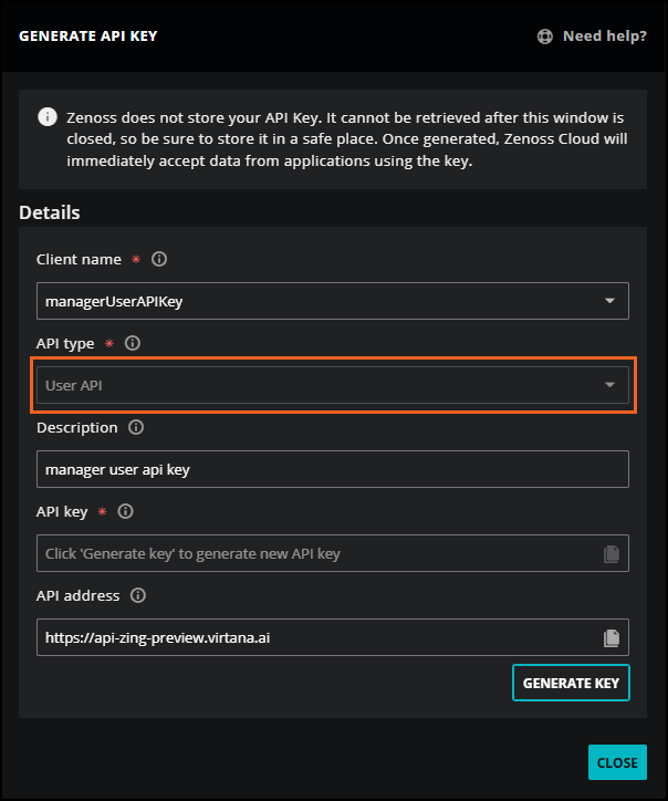 When generating an API key on the ADMIN > API Clients page, select User API in the API type field.
