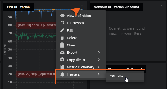 (Optional) Hides or displays configured threshold limits in the graph for any applicable metrics. When on, the threshold for the applicable metric appears in the graph as a dashed red line. You can also select Triggers using the More actions menu (⋮) on the tile.